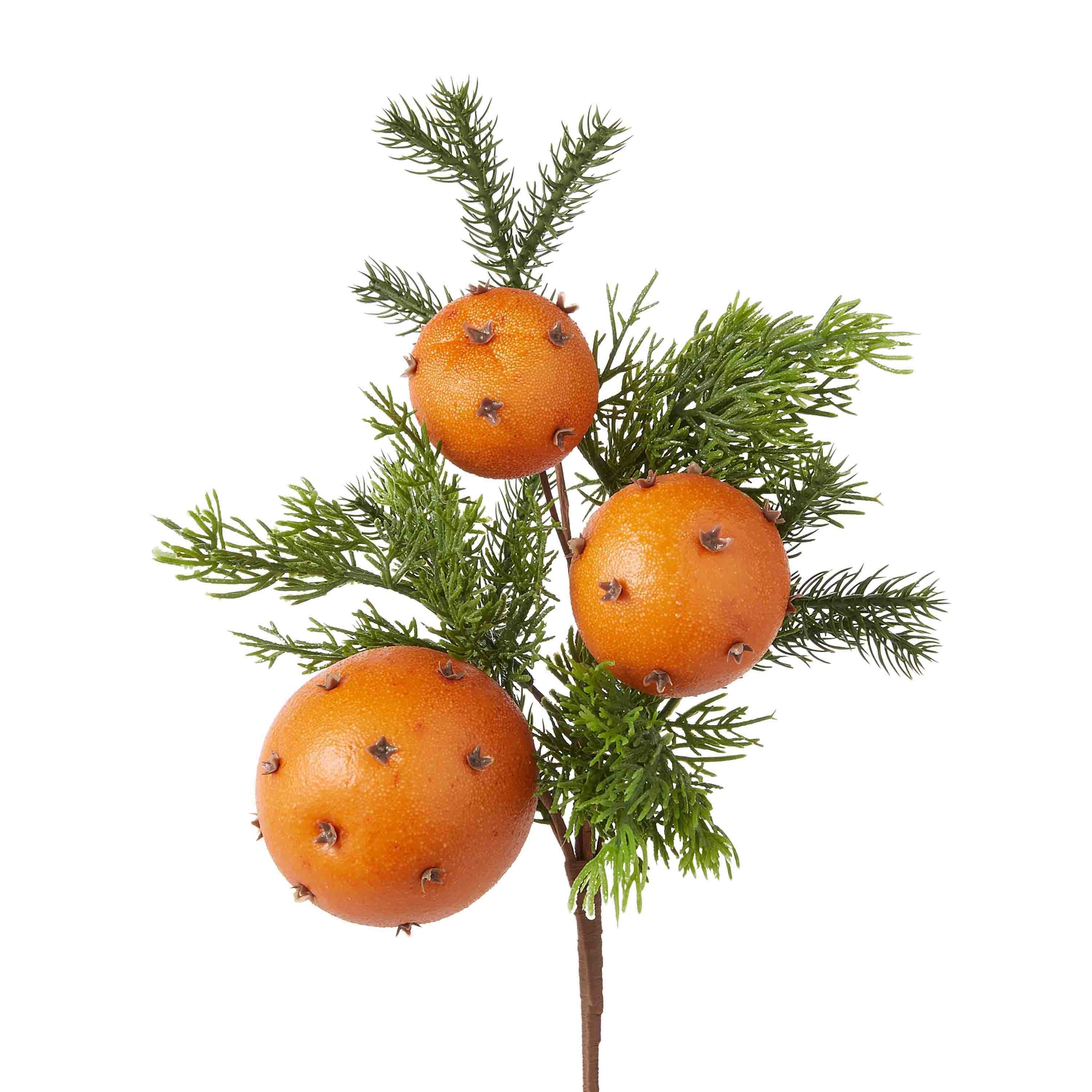 Once upon a winter’s eve, when the air was rich with the scent of pine and spice, a little sprig was born from the heart of the holiday season. This charming 15" Clove Orange & Pine Spray twirls together the magic of pomander balls—tiny Styrofoam oranges that look as though they’ve been kissed with cloves—and the soft, wintry needles of faux pine. Together, they whisper stories of old-fashioned Christmases, where oranges were treasures and pine boughs framed every glowing hearth.