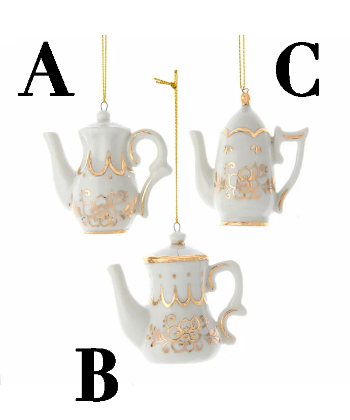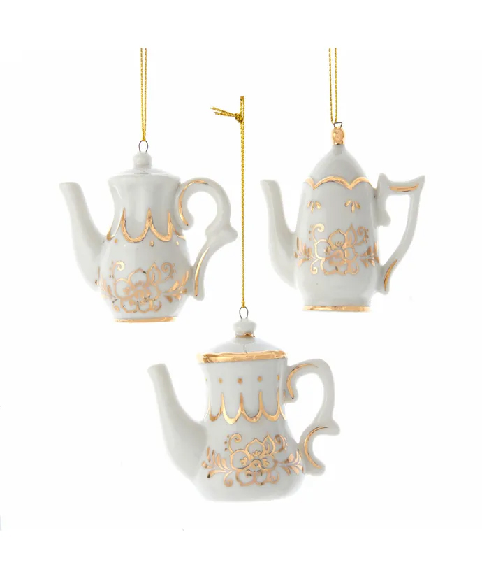 These white and gold teapot ornaments from Kurt Adler are a festive addition to any holiday décor or Christmas tree. This assortment features three uniquely shaped teapot ornaments; each teapot is decorated with an intricate gold pattern.