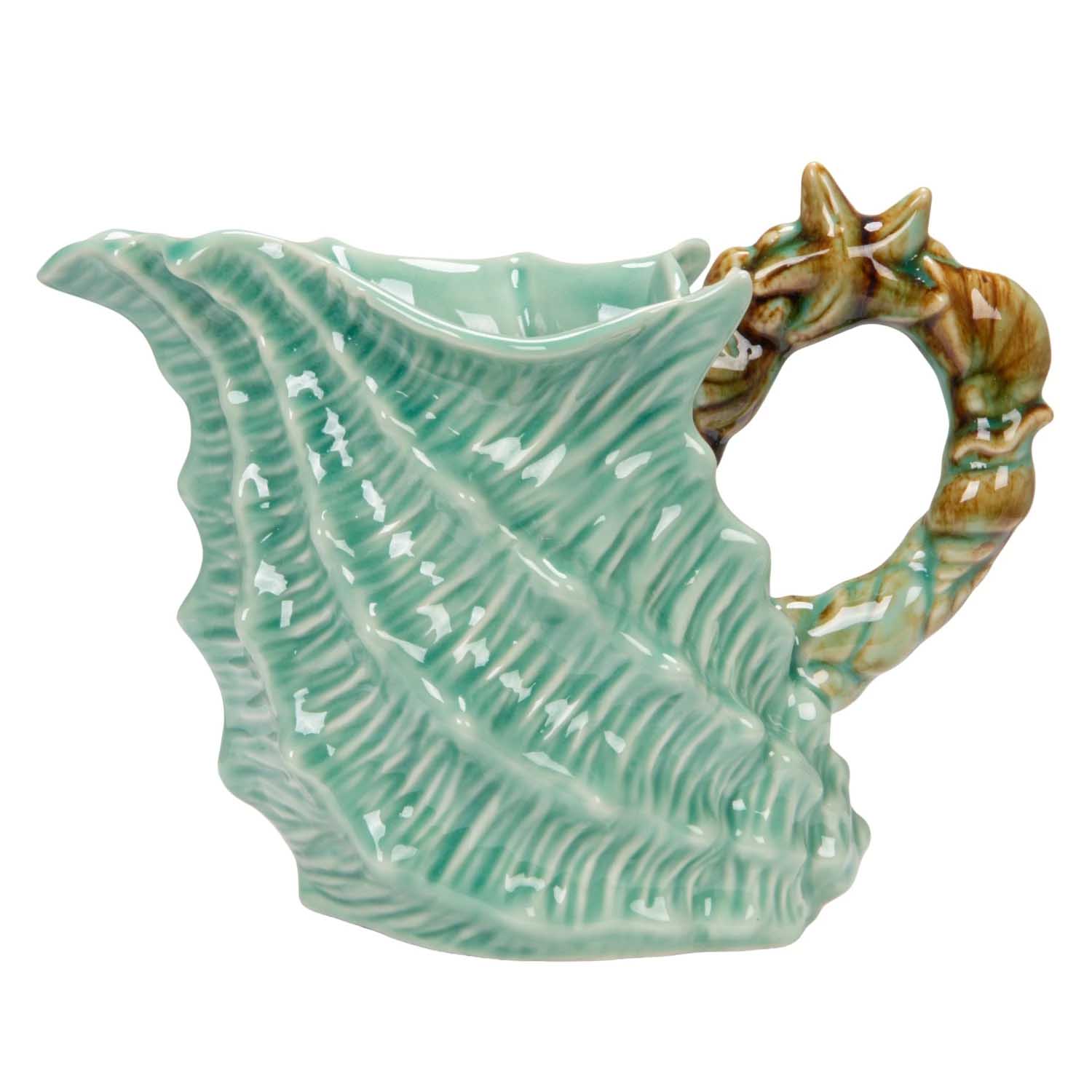 Bring the charm of the seaside to your table with this beautifully crafted Blue Conch Stoneware Pitcher. Designed in the shape of a textured seashell, this coastal-inspired piece blends artistry with everyday function. Its unique handle—adorned with sculpted starfish and shell accents in warm brown tones—adds a stylish, beachy flair that makes it perfect for serving or display.
