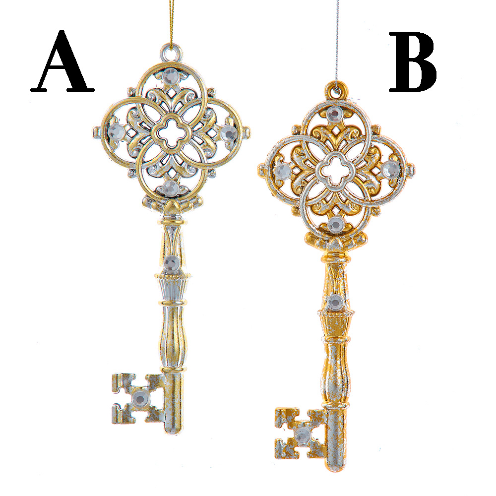 These ombré key ornaments from Kurt Adler are a festive addition to any holiday décor or Christmas tree. This assortment features a gold ombré and a silver ombré key ornament, each key is decorated with clear gemstone accents.