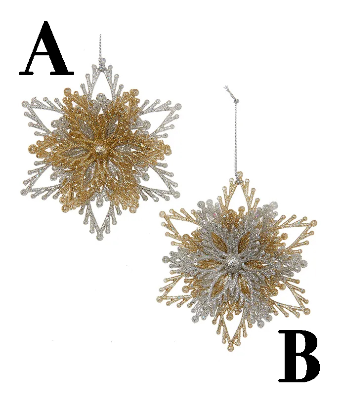Description Specifications Gold & Silver Snowflake Acrylic Ornaments Add some sparkle to any holiday décor or Christmas tree with these gold and silver snowflake burst ornaments from Kurt Adler. **Sold Separately** Measurements: 4" Materials: Acrylic
