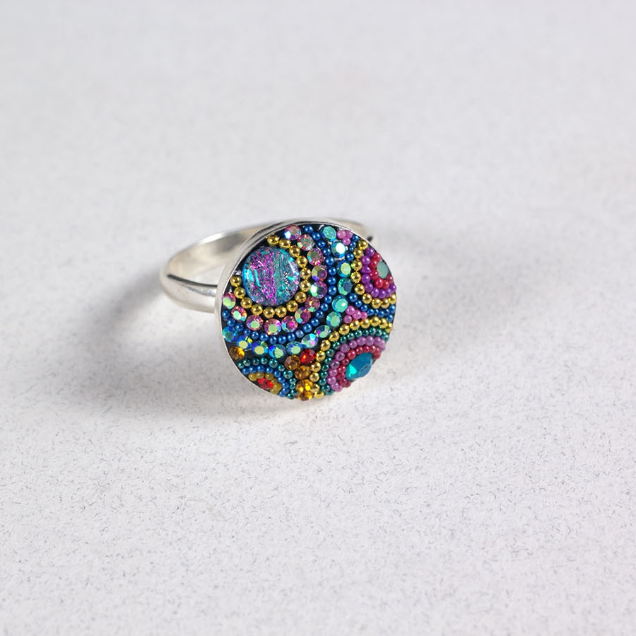The ring’s surface is adorned with an intricate mosaic of hand‑set crystals and microbeads, arranged in dynamic kaleidoscope patterns. Rich hues and iridescent details shimmer with movement, revealing new color combinations from every angle. Set within a polished sterling silver bezel, the adjustable band ensures a comfortable, versatile fit while allowing the radiant design to take center stage.