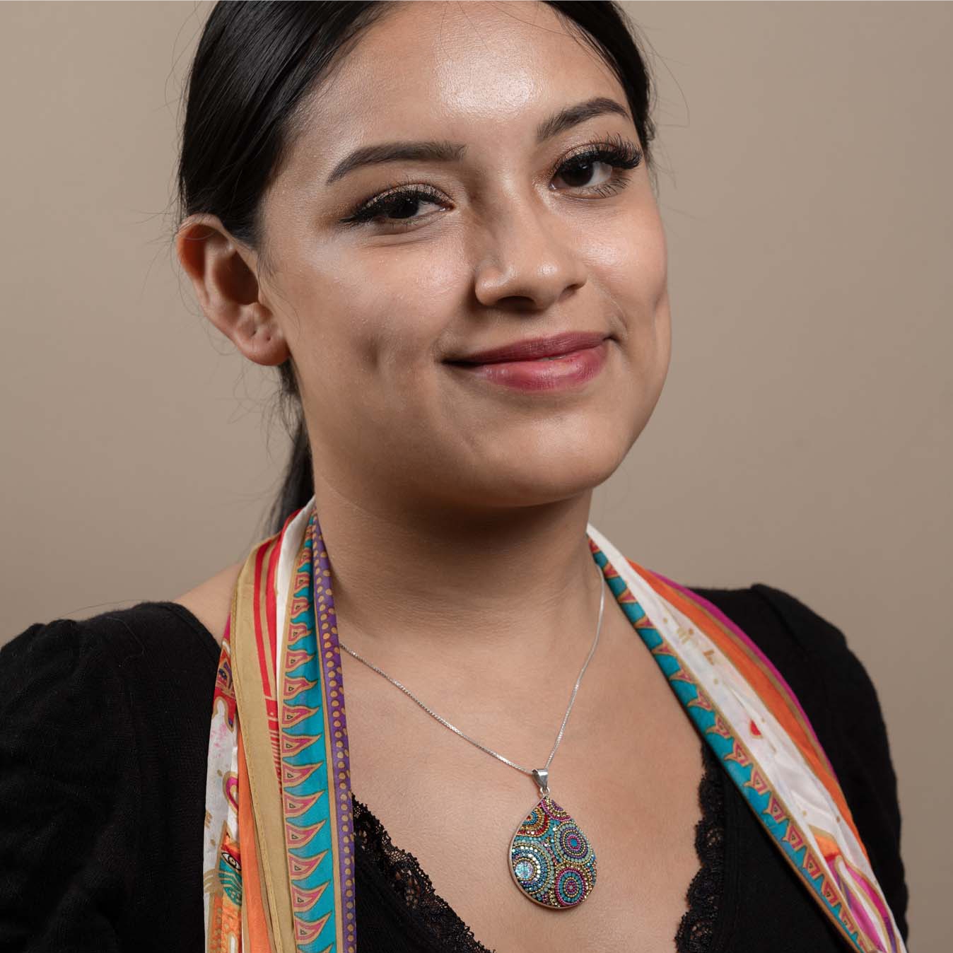 The Kaleidoscope Dew Drop Pendant Necklace is handcrafted by the artisans of Mosaico, whose work reflects more than 40 years of artistic tradition rooted in the celebrated silversmithing heritage of Taxco, Mexico. Founded by artists Gloria Higuera and David Mercer, Mosaico brings together time‑honored techniques and modern, color‑forward design.