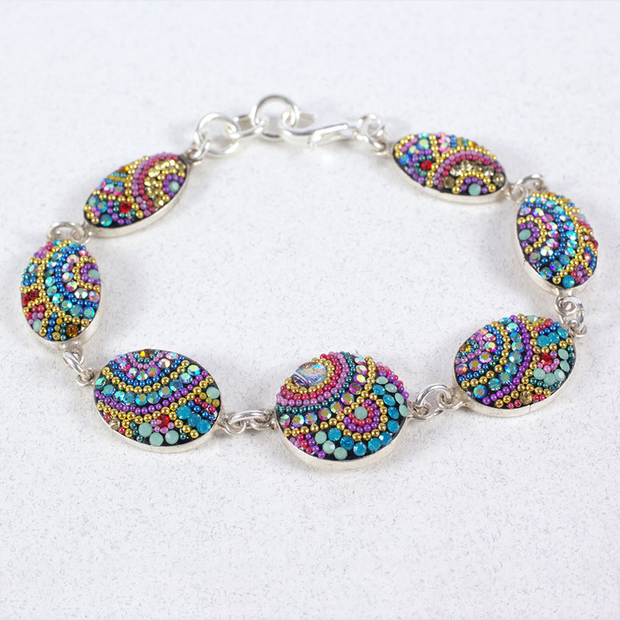 Step into a world of color and craftsmanship with the Kaleidoscope Edgeless Bracelet by Mosaico. This striking piece features smooth, edgeless oval elements filled with a dazzling array of miniature Austrian crystals and microbeads. Each vibrant pattern forms a lively spectrum, just like the ever‑changing view inside a kaleidoscope, making this bracelet a true celebration of color, creativity, and joyful expression.