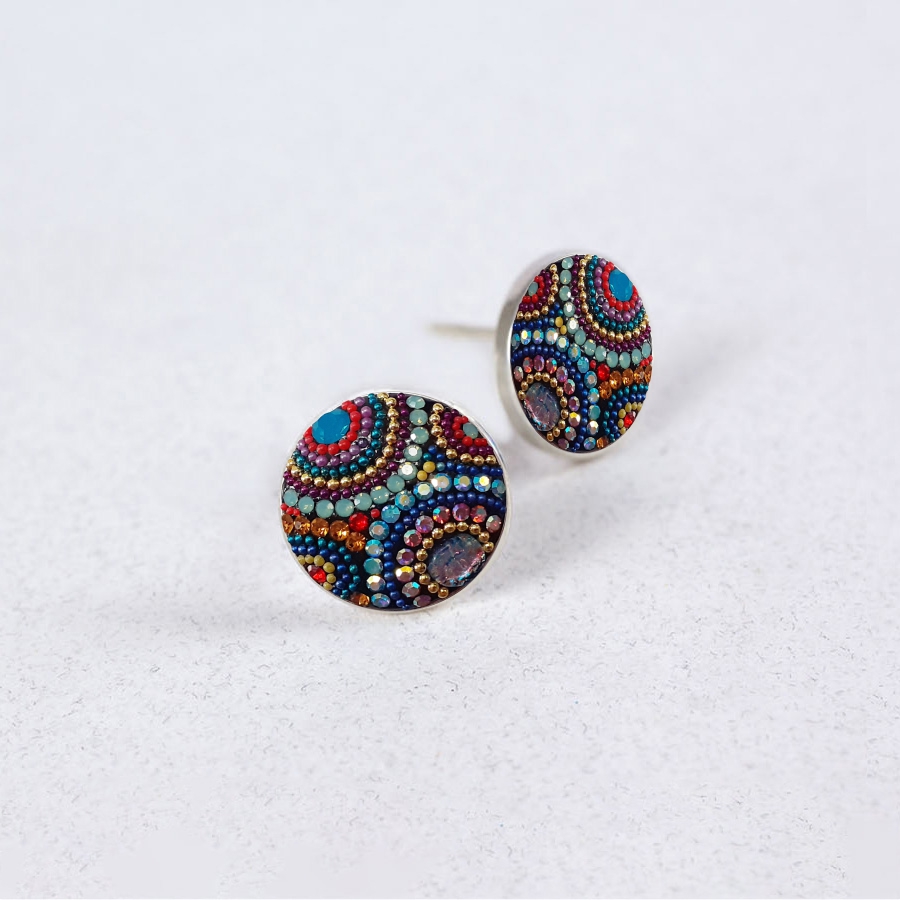 Bold, colorful, and beautifully refined, the Mosaico Kaleidoscope Large Round Stud Earrings bring an artful burst of color to a classic silhouette. Measuring 18mm, these statement studs elevate any look with their radiant mosaic of crystals and microbeads—each one arranged by hand into vibrant, swirling patterns that catch the light from every angle.