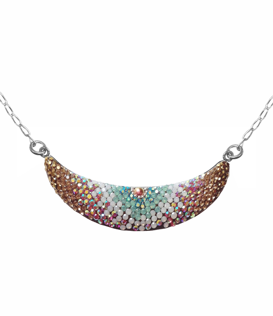 The gracefully curved luna bar is adorned with hand‑set Austrian crystals and micro beads, arranged in a vibrant mosaic inspired by a colorful spectrum. The Kaleidoscope colorway blends shimmering golds, turquoise, rose, violet, and iridescent hues, creating depth and movement that catches the light beautifully. Framed in polished silver and suspended from a substantial silver chain, the necklace balances bold presence with refined elegance.