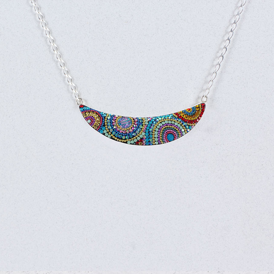 This graceful crescent‑shaped bar pendant is brought to life with a vibrant mosaic of miniature crystals and microbeads, arranged in bold, swirling patterns inspired by a kaleidoscope of color. The iridescent hues shift gently with the light, offering a dynamic expression of creativity and individuality. Suspended from a delicate sterling‑silver chain, the necklace rests elegantly along the neckline, making it a striking yet wearable statement piece.