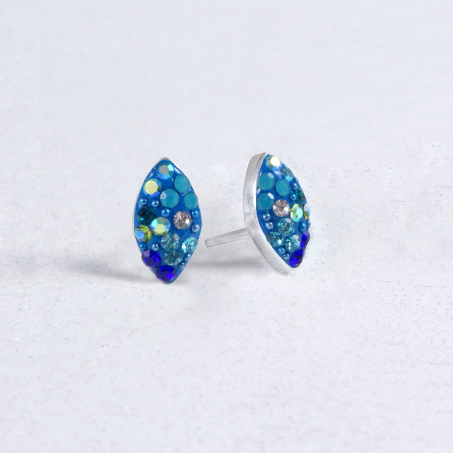 Each earring features hand‑set miniature crystals in luminous blue tones, carefully arranged to echo the movement and depth of ocean waves. Just as every wave is unique, each mosaic pattern is subtly different, capturing the organic beauty of the sea in a graceful, wearable design.